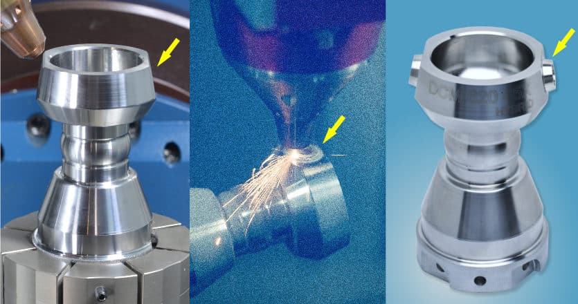 Estrategicamente, é possível adicionar materiais de maior resistência em determinadas regiões da peça onde ocorre maior desgaste, como no caso de ferramentas de estampo, obtendo-se maior eficiência com menor custo. O cabeçote laser que executa a fusão do material em pó, pode também realizar operações de gravação.